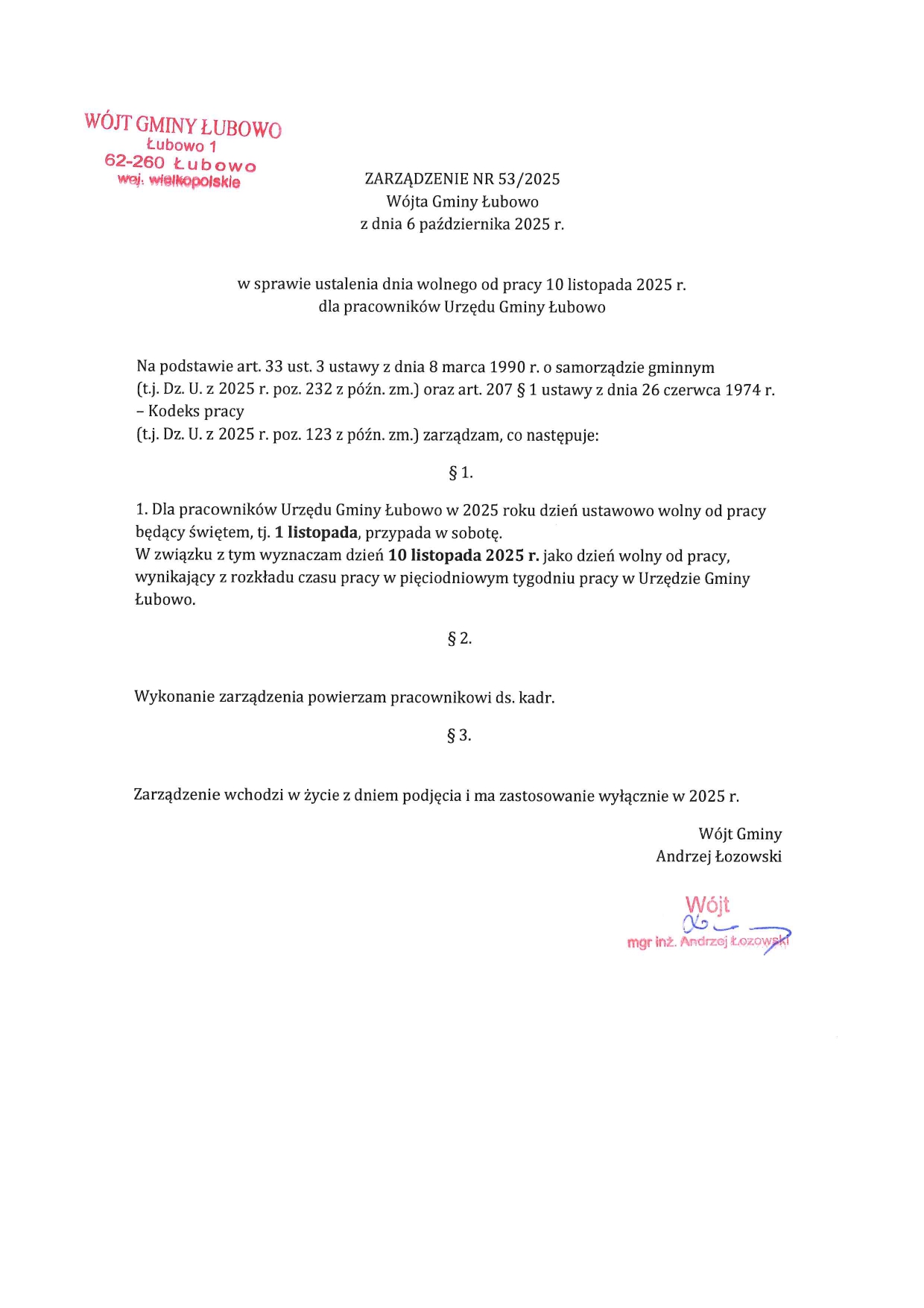 10 listopada 2025r. Urząd Gminy Łubowo będzie NIECZYNNY