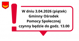 Zgodnie z Zarządzeniem Kierownika Gminnego Ośrodka Pomocy Społecznej, informujemy iż, w dniu 03.04.2026 r. GOPS będzie czynny w godzinach od 07:15 do 13:00.