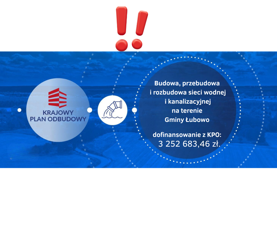 Miło nam poinformować, że wniosek złożony przez Gminę Łubowo, pn. „Budowa, przebudowa i rozbudowa sieci wodnej i kanalizacyjnej na terenie Gminy Łubowo”, został dofinansowany w wysokości 3 252 683,46 zł.