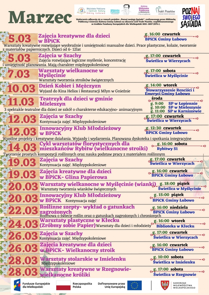 Warsztaty i zajęcia realizowane w ramach projektu „Poznaj swojego Sąsiada”, współfinansowanego ze środków Europejskiego Funduszu Społecznego Plus (EFS+) w ramach programu Fundusze Europejskie dla Wielkopolski 2021–2027. Partnerami projektu są: Biblioteka Publiczna Miasta i Gminy Kłecko oraz Gminna Biblioteka Publiczna w Mieleszynie.