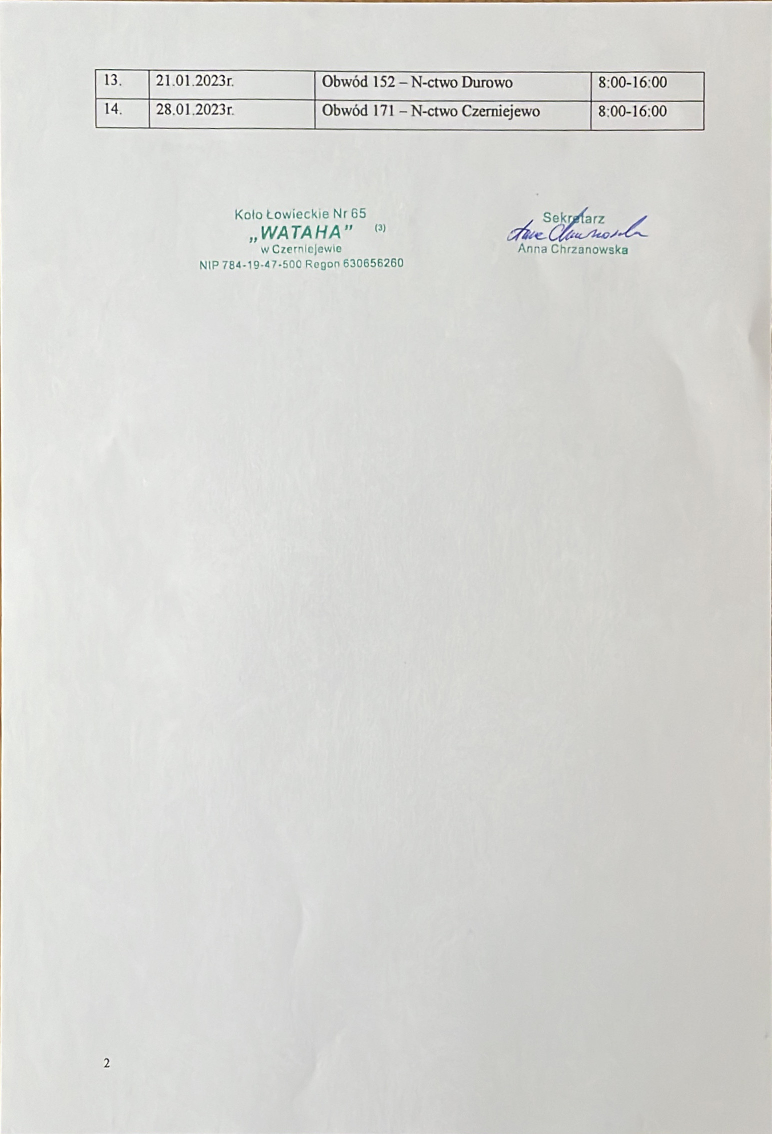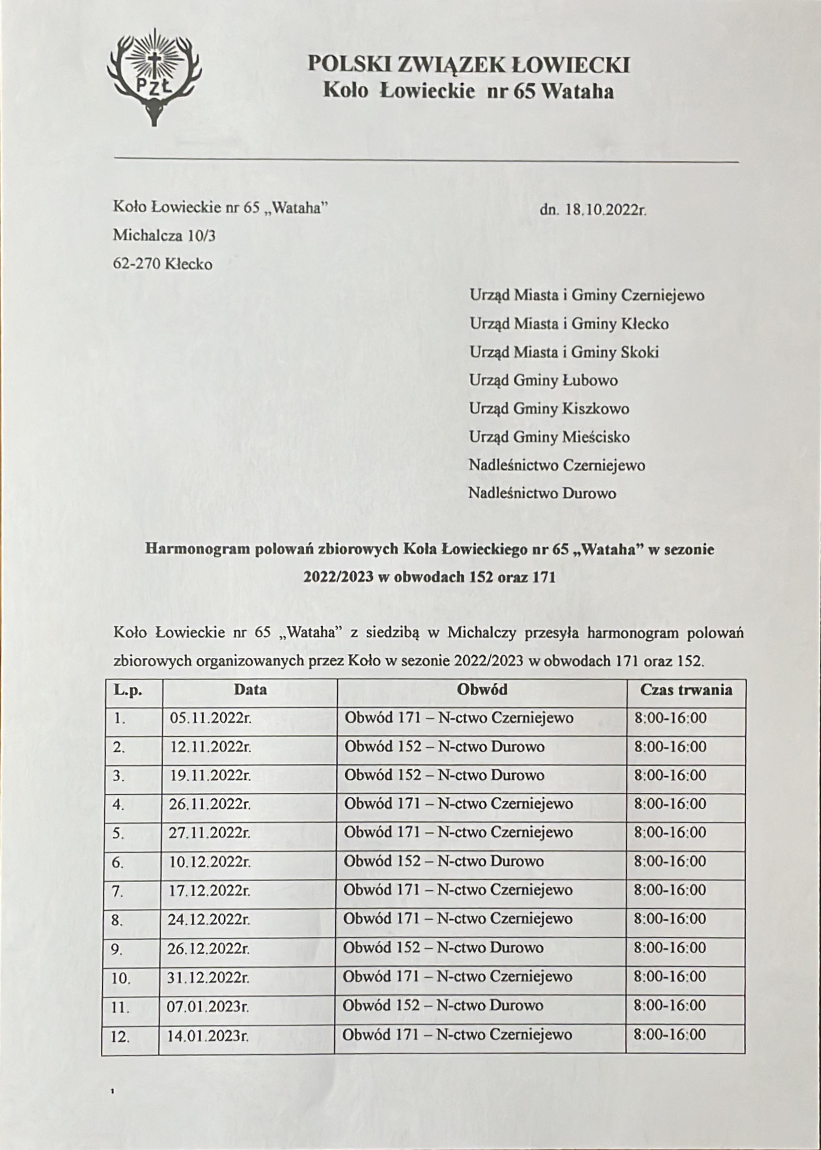 Kalendarz Polowań zbiorowych w Kole Łowieckim nr 65 "Wataha" w sezonie łowieckim 2022-2023