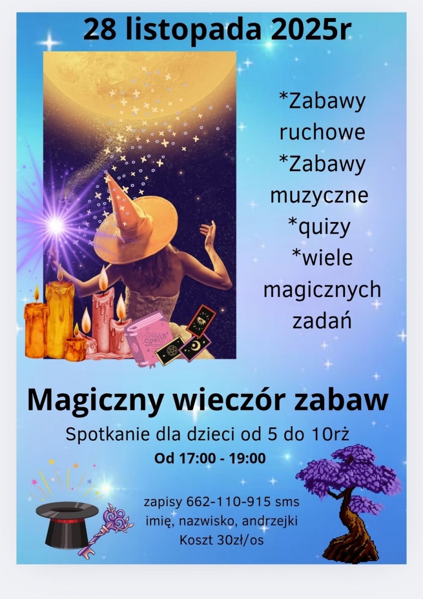 Serdecznie zapraszamy dzieci w wieku od 5 do 10 lat na magiczny wieczór andrzejkowy pełen energii i zabawy!