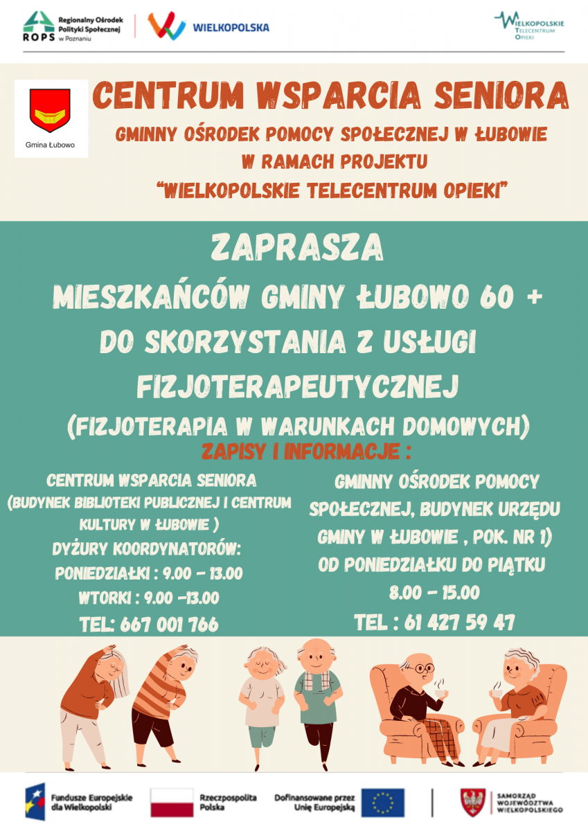 Centrum Wsparcia Seniora w Łubowie zaprasza Seniorów 60+ z terenu Gminy Łubowo do skorzystania z mobilnej usługi fizjoterapeutycznej. Usługa  skierowana jest do Seniorów będących po zabiegach operacyjnych, mających problemy z poruszaniem się, a także z dojazdem do placówek fizjoterapeutycznych.