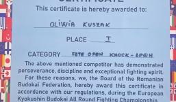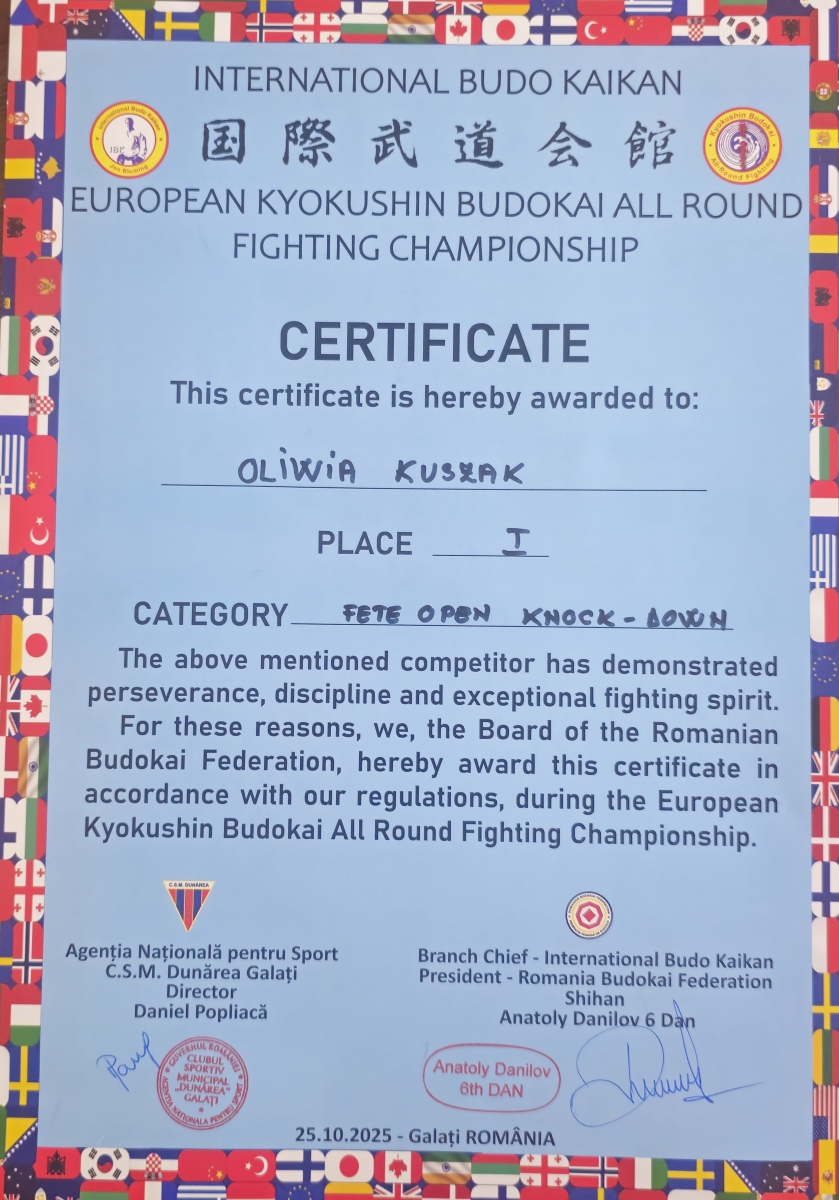 Mieszkanka Pierzysk 25 października 2025r w Galați (Rumunia) po trudnych, wymagających walkach na European Kyokushin Budokai All-round Figting Championship zajęła 1 miejsce w kategorii knock-down.