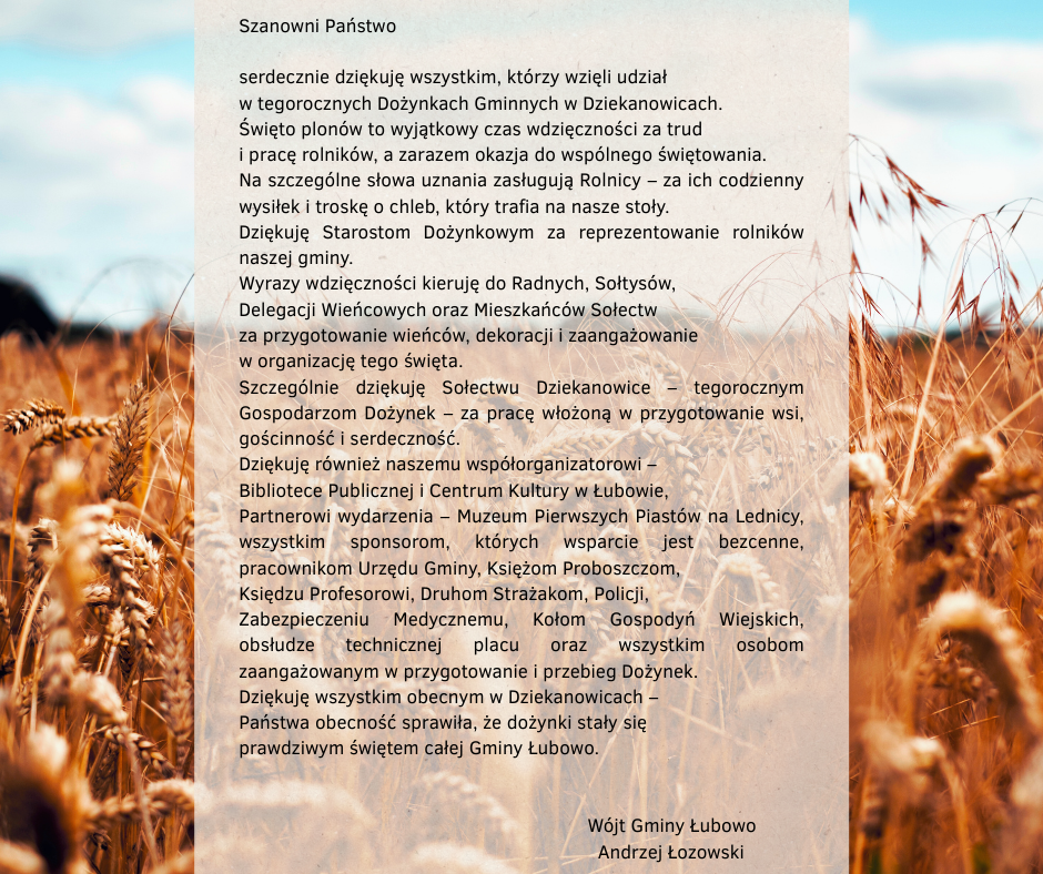 Podziękowania Wójta Gminy Łubowo - Dożynki 2025