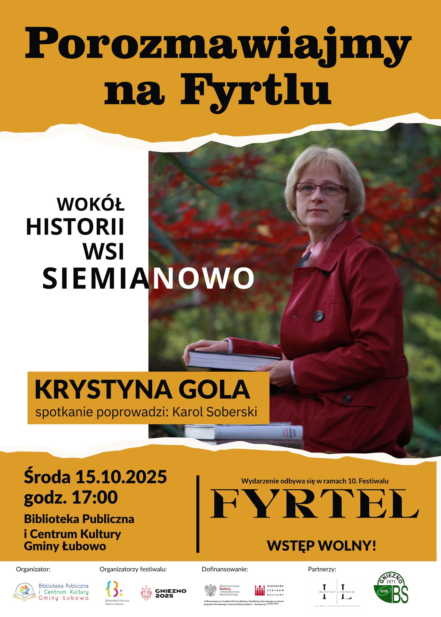 Gościem spotkania będzie Krystyna Gola – regionalistka, historyczka i autorka publikacji poświęconych dziedzictwu naszego regionu. Pochodzi z Siemianowa, mieszka w Gnieźnie. Jest nauczycielką historii i wiedzy o społeczeństwie oraz autorką książki „Tutaj, gdzie rosną stare drzewa” o historii Szkoły Podstawowej Tysiąclecia w Lednogórze. Współautorka opracowania „Dziedzictwo narodowe w regionie”.