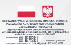 359 007,00 zł na rok 2026, 359 007,00 zł na rok 2027 zł i 356 169,00 zł na rok 2028 do projektu pod nazwą Dofinansowanie publicznego transportu zbiorowego w zakresie przewozów autobusowych o charakterze użyteczności publicznej na linii DRS, DRS/1, DRS/2, DRS/3. Całkowita wartość projektu to 1 235 310,45 zł.