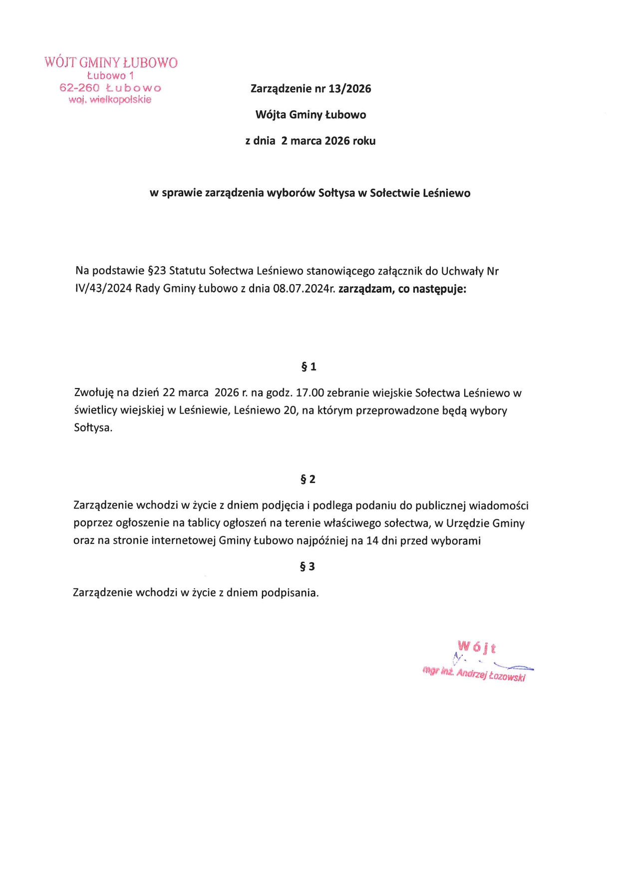 Zarządzenie nr 13/2026 Wójta Gminy Łubowo z dnia 2 marca 2026 roku w sprawie zarządzenia wyborów Sołtysa w Sołectwie Leśniewo
