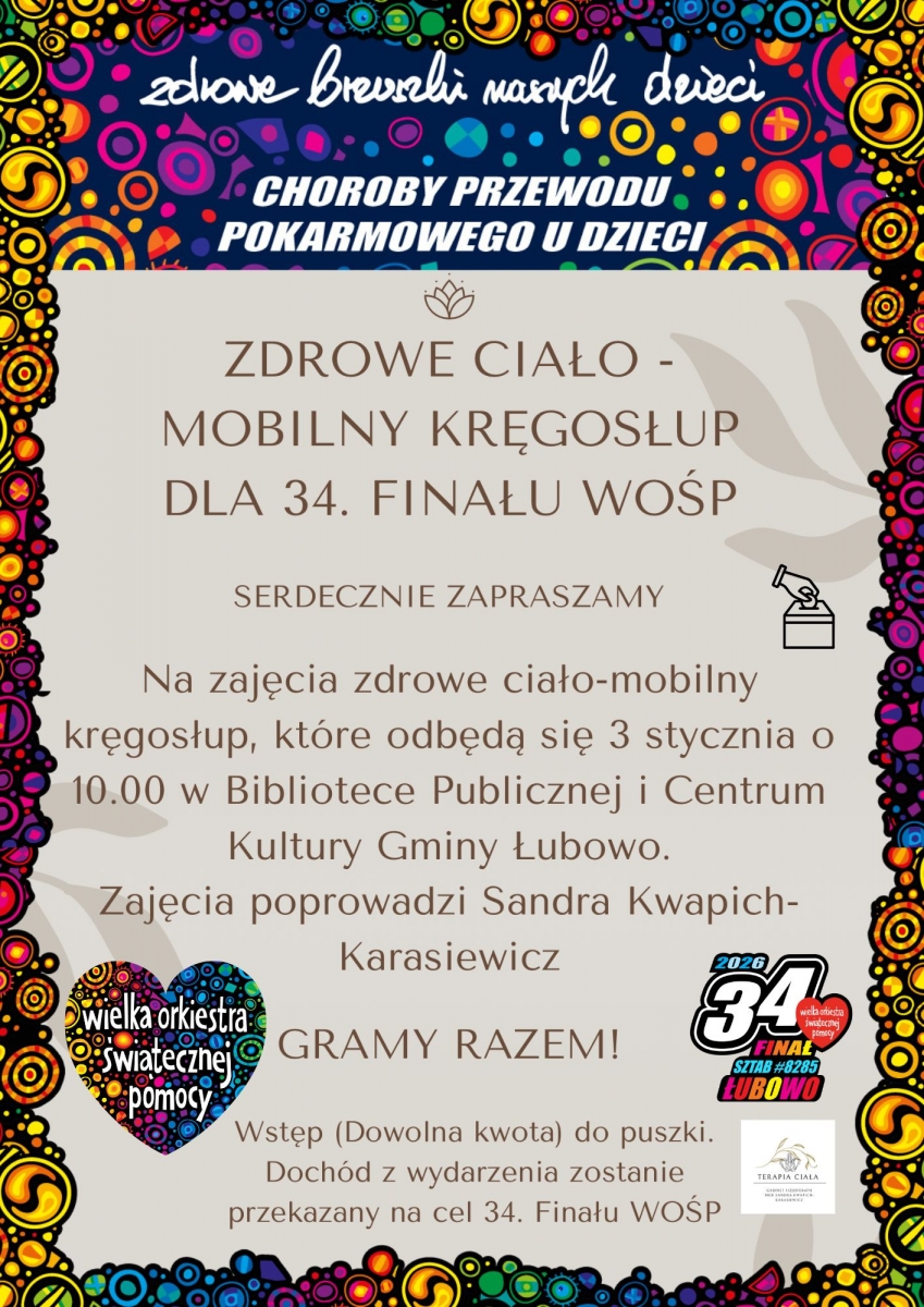 Zapraszamy serdecznie 3 stycznia o godz. 10:00 na wydarzenie: Zdrowe Ciało- mobilny kręgosłup dla 34. Finału WOŚP.